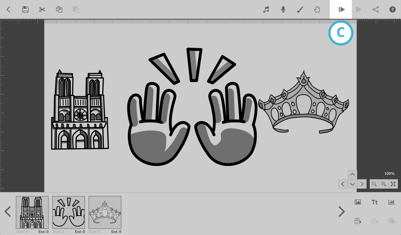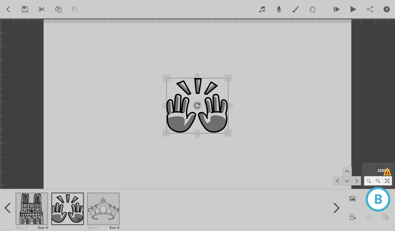 - Extreme zooming takes up a lot of memory. Instead of large zooms, use more of the canvas. We recommend keeping your camera zoom between 25% - 500% range for every element (A)